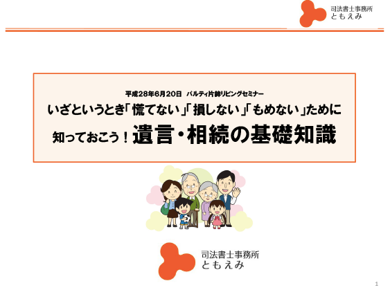![]()  実施報告 2016年 安心な老後と幸せな相続セミナー2016 いざというとき「慌てない」「もめない」「損しない」ための 相続・遺言はじめの一歩 第一生命様主催、安心な老後と幸せな相続セミナー2016にて、司法書士事務所ともえみ代表山口...