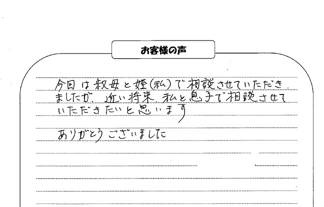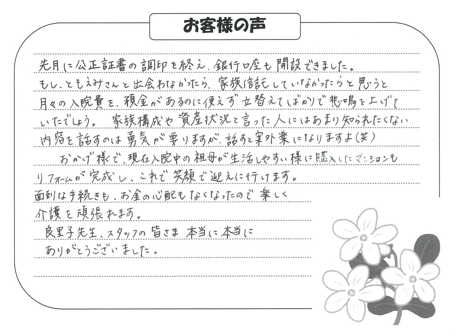 ![]()  先々母に何かあったどうしようと不安でしたが、家族信託は心強い1つの手段になりました。