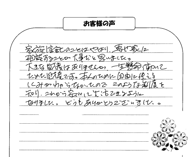 ![]()  家族信託のことはやはり、専門家に相談することが大事。安心して生活できるようになりました。