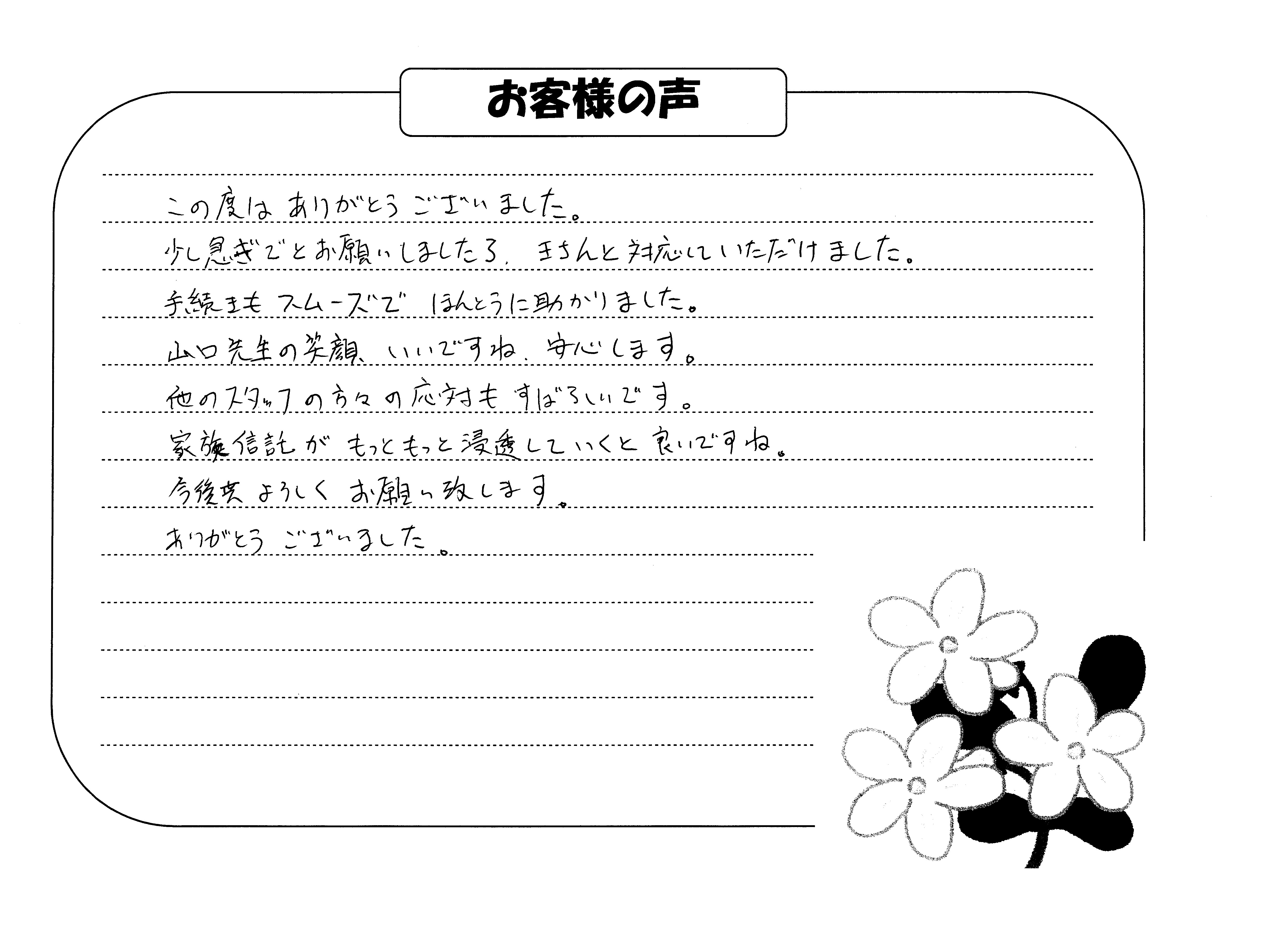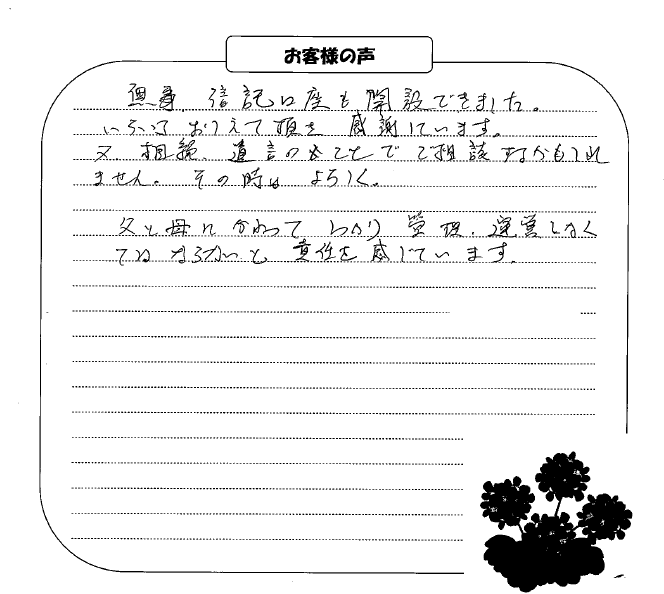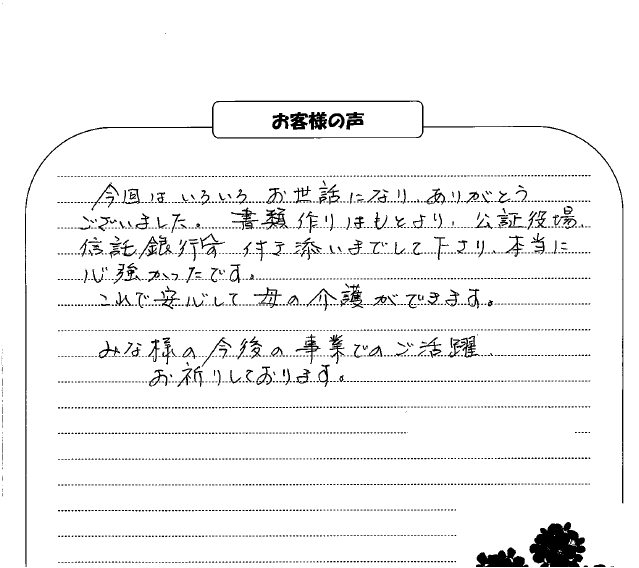 ![]()  手続きもスムーズでほんとうに助かりました。家族信託がもっともっと浸透していくと良いですね。
