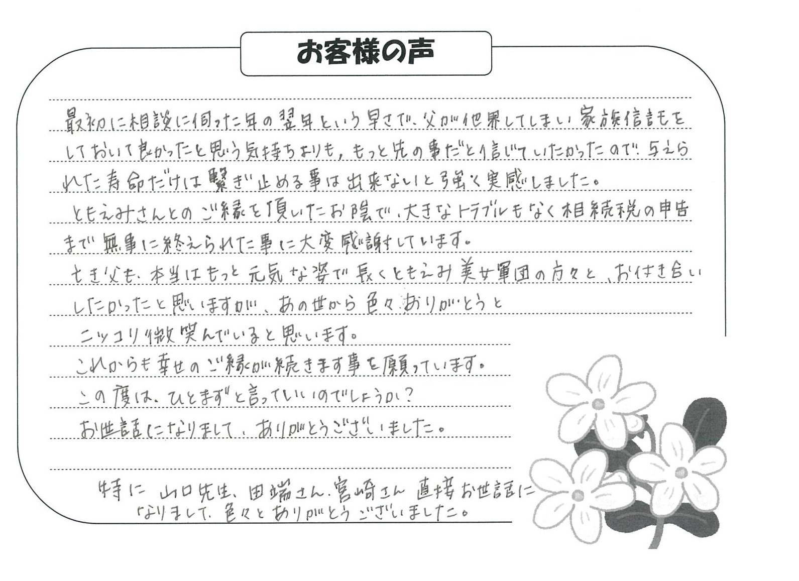 ![]()  家族信託契約から1年という早さで、父が他界。大きなトラブルもなく相続税の申告まで無事に終えられた事に大変感謝しています。