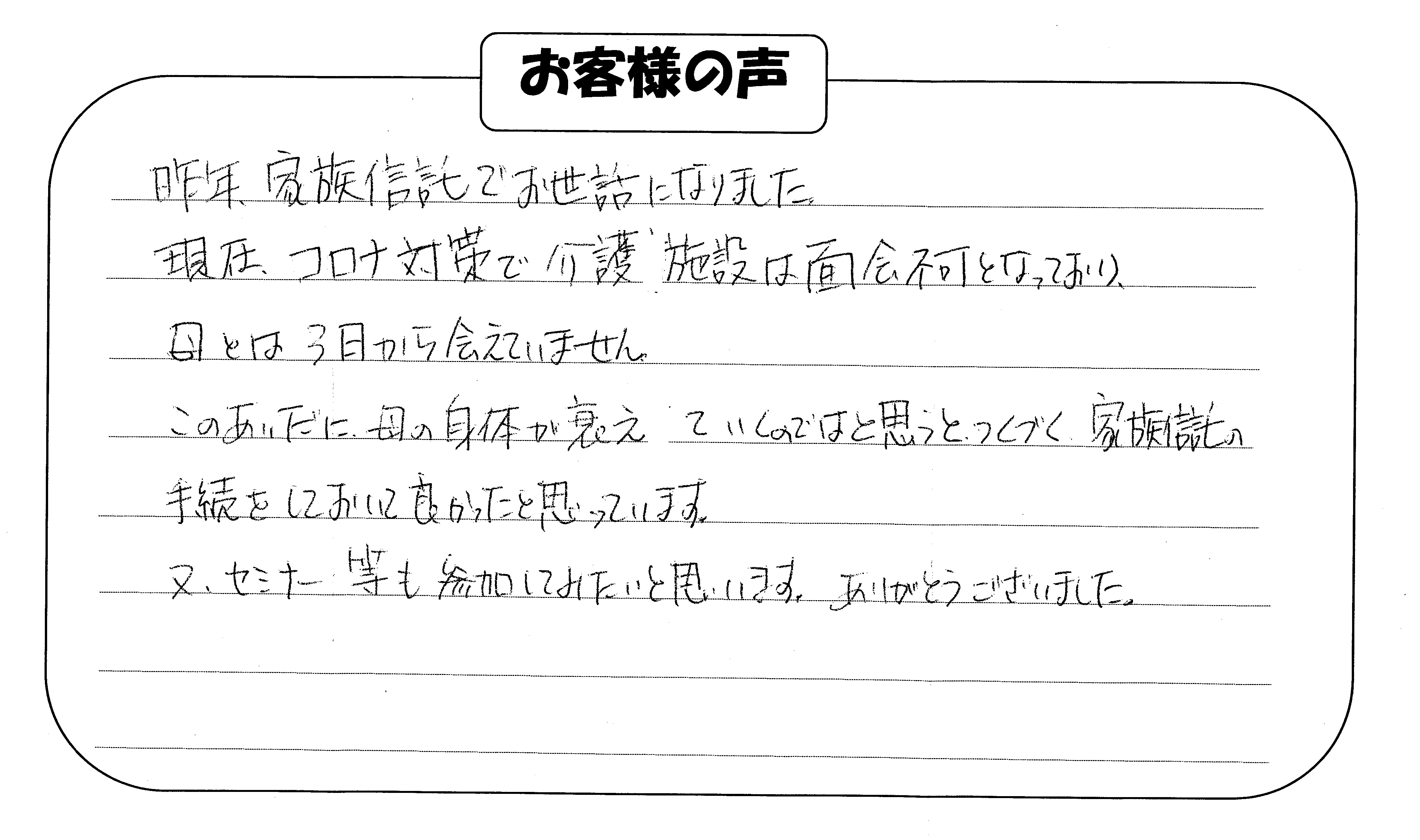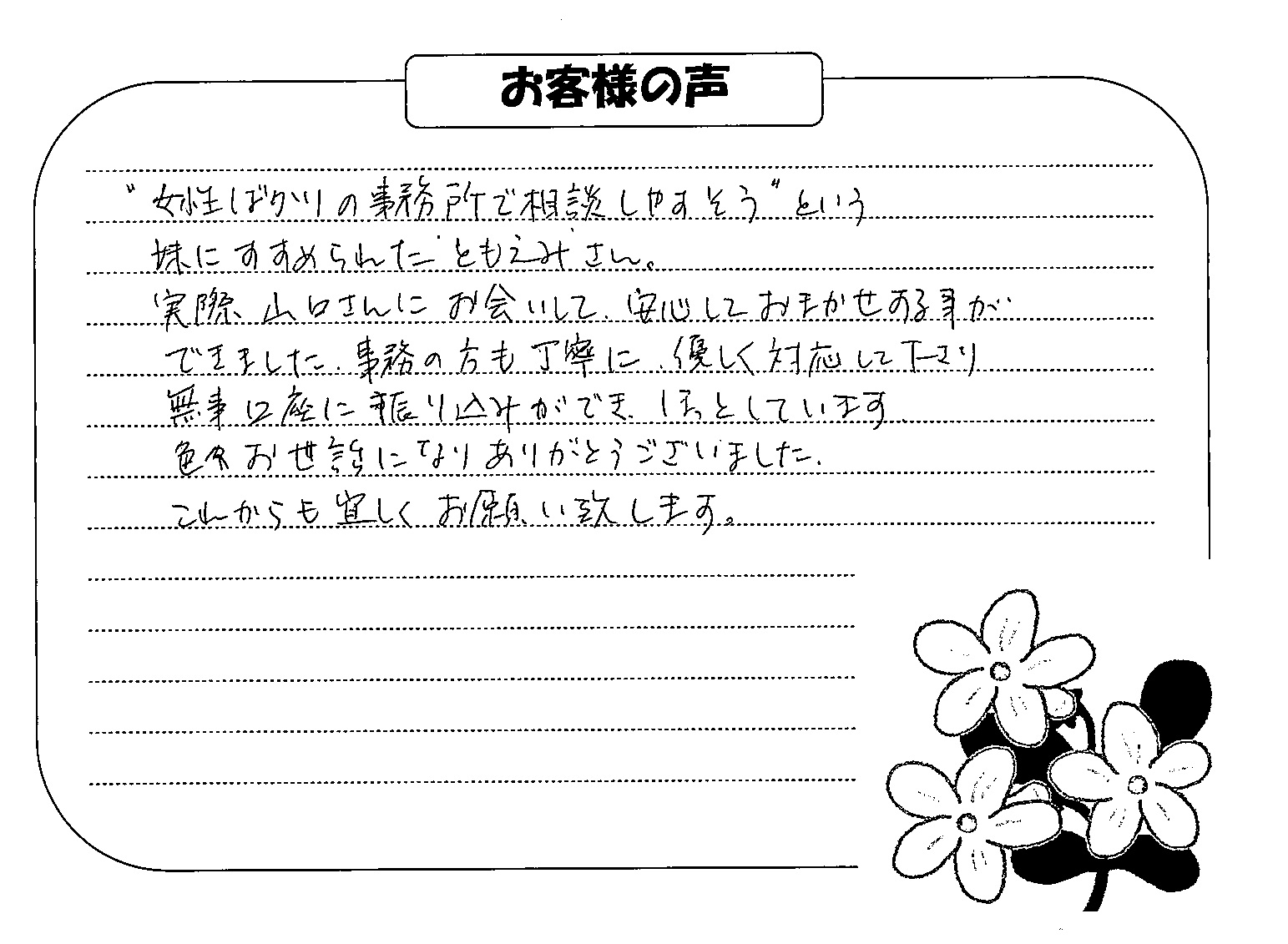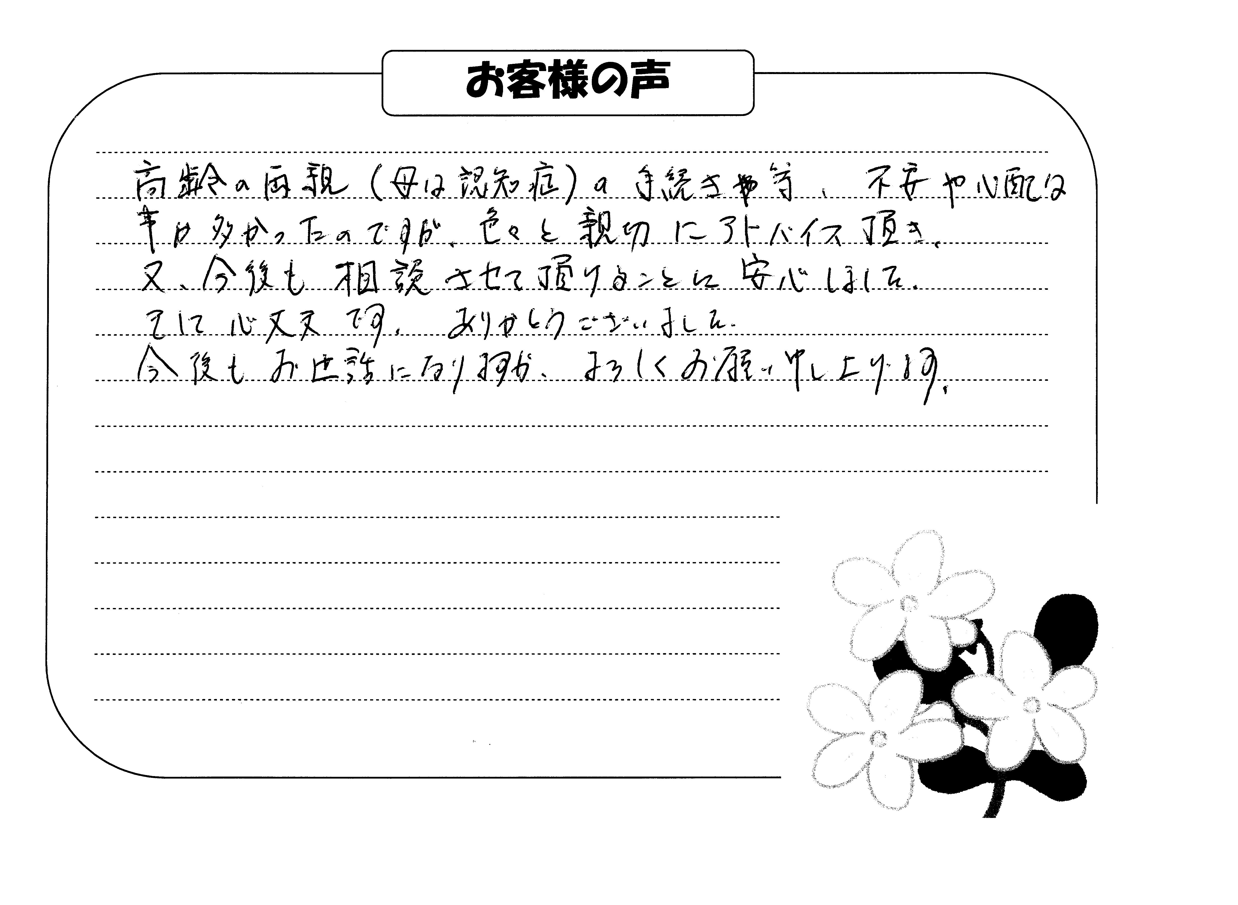 ![]()  高齢の両親(母は認知症)の手続き、不安や心配な事が多かった。今後も相談させていただけることに安心